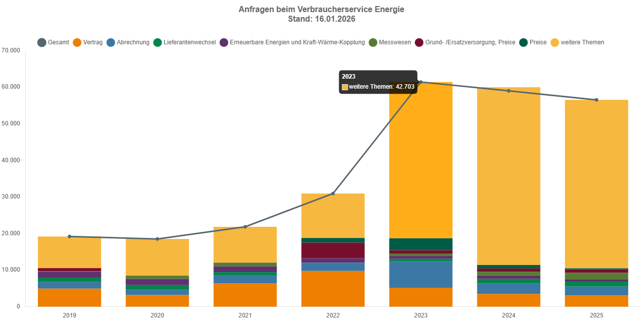 Das Niveau der Beschwerden- und Anfragenzahl ist im Jahr 2025 ähnlich gewesen wie 2024. Nach fast exakt 59.000 Eingängen beim Verbraucherservice Energie im Jahr 2024 ist die Zahl 2025 um knapp 2.450 auf etwa 56.500 zurückgegangen.