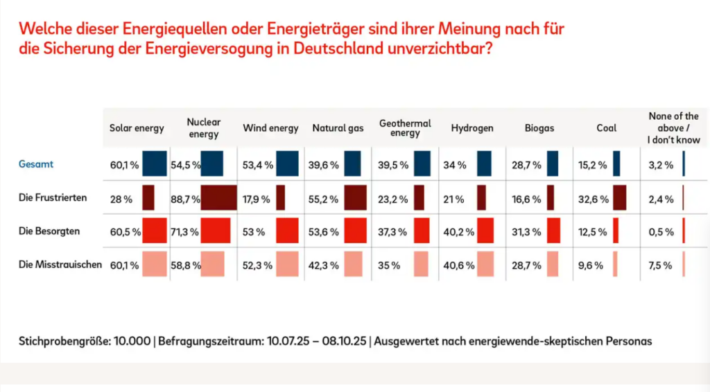 Speziell bei den Frustrierten (88,7 Prozent) und Besorgten (71,3 Prozent) ist der Rückhalt für Atomkraft besonders hoch, doch auch 58,8 Prozent der Misstrauischen halten Kernenergie für unverzichtbar. Paradoxerweise schreiben die Besorgten und Misstrauischen der Solar- und Windenergie eine ähnlich hohe Bedeutung zu wie die Gesamtbevölkerung.