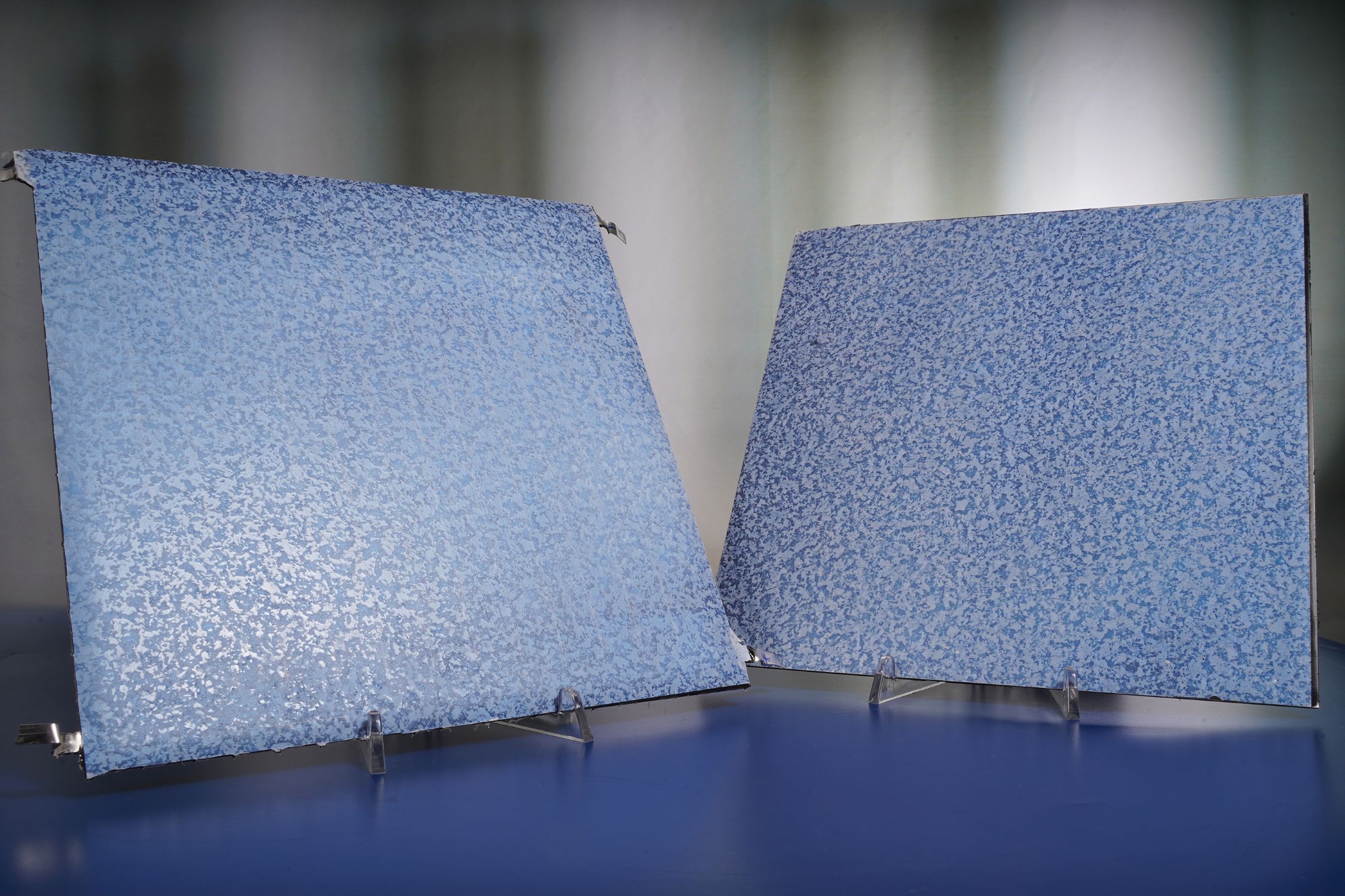 Mit Dekorfolie kaschierte, frei kombinierbare Fassadenelemente – links ein PV-Modul und rechts ein Blechfassadenelement ohne PV-Funktionalität (Bild: Fraunhofer FEP)