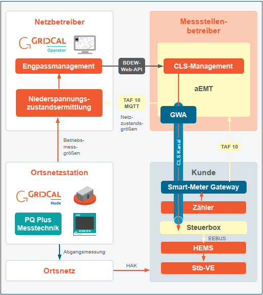 Die Ermittlung der Netzzustandsdaten erfolgt bei GridCal über die Software-Lösung „Node“. Diese erhebt hierzu dynamische Netzparameter direkt in der Ortsnetzstation und ermöglicht durch Edge Computing sowie eines digitalen Zwillings die autonome Netzzustandsanalyse vor Ort – inklusive Engpasserkennung. Konkret liefern die Nodes von der Feldebene Betriebsmessgrößen auf Abruf an den zentralen „Operator“, wodurch etwa der Bedarf an kostenpflichtigen TAF 10 Daten um bis zu 75 Prozent sinken soll. Via MQTT kann der Operator diese zusätzlich vom aEMT des Messstellenbetreibers (MSB) beziehen, während er zum Engpassmanagement Daten über BDEW-Web-API an das CLS-Management des MSB sendet. Steuerbefehle können dann über einen Gateway-Administrator (via CLS-Kanal) an die Steuerbox bis zum HEMS und die Verbrauchseinrichtungen eines Kunden gehen.