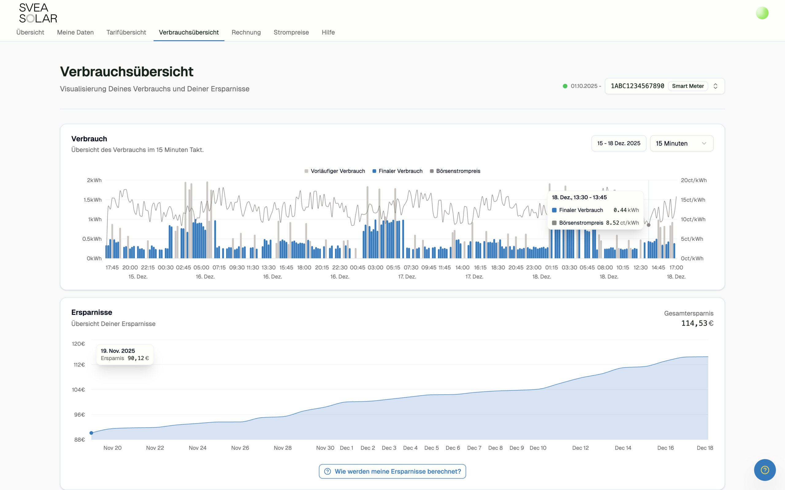 Die digitale Verbrauchsübersucht von Svea Solar visualisiert die Verbrauchswerte im 15 Minuten Takt. Voraussetzung ist der Einbau eines intelligenten Messsystems. (Bild: Svea Solar Deutschland GmbH)